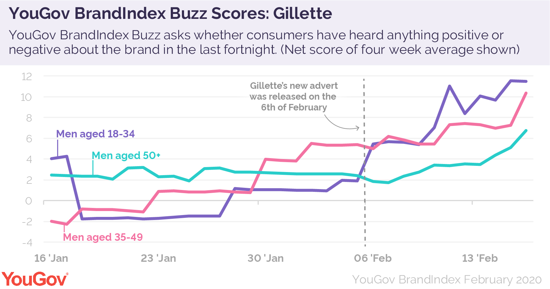 YouGov Plan & Track data shows that since the advert’s release on the 6th of February, Gillette’s Buzz score has risen sharply. This is especially true among men aged 18 to 34, where the brand’s Buzz score peaked at 11.6, increasing by 9.6 points since the advert first aired. It was a similar story among men of other age groups - scores for those aged 35-49 reached a high of 10.4 (up 5.3 points), while Buzz among those aged 50+ hit 6.7 (an improvement of 3.9).